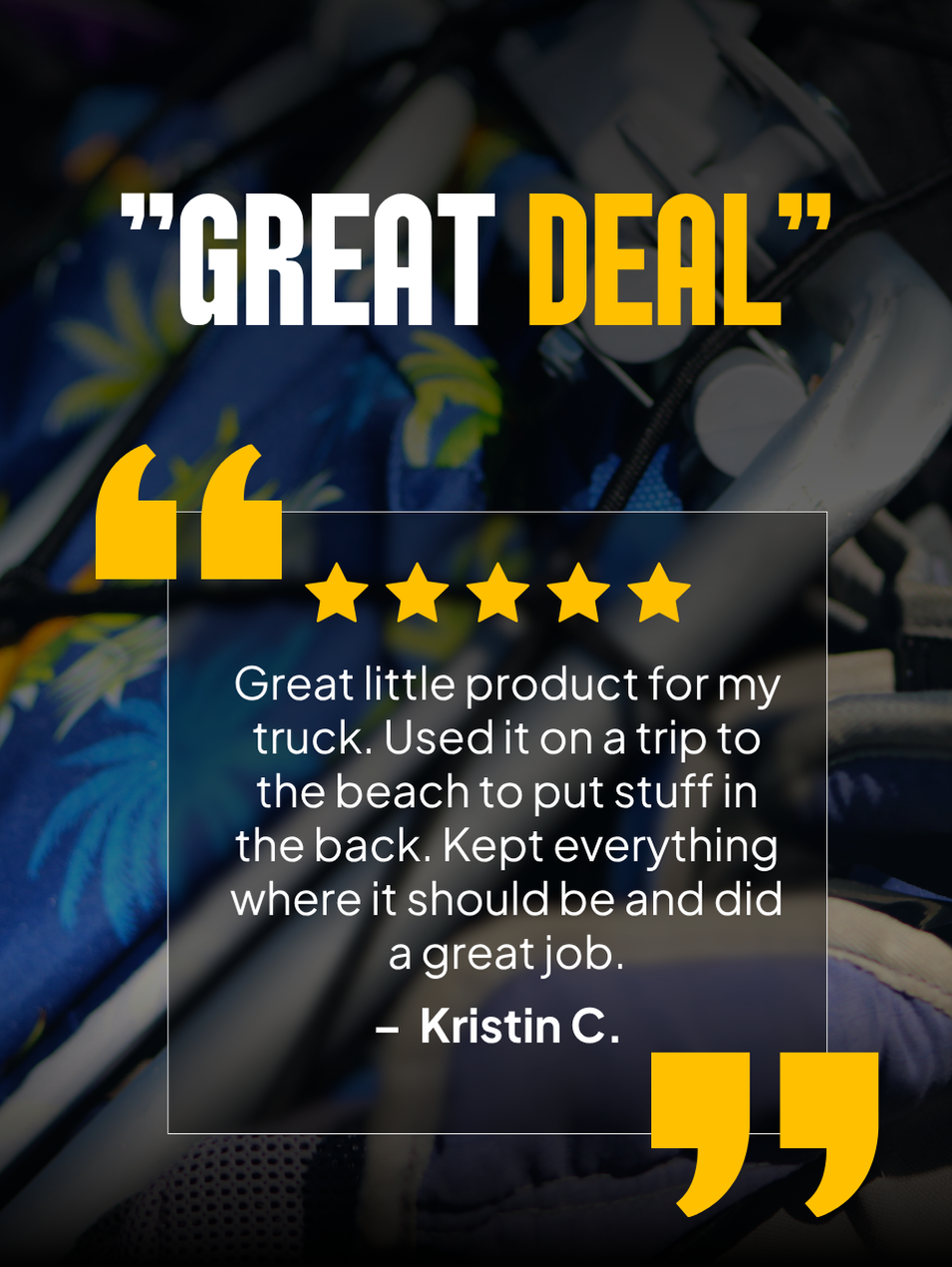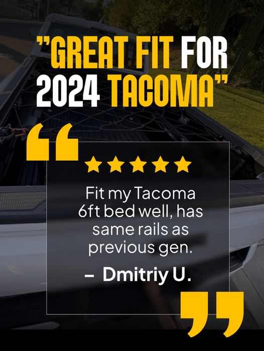 After so many years of searching for the perfect net for the Toyota Tacoma, things became evident: it didn’t exist. Thus, husband and wife duo, Chuck and Kristin, set out on a journey to make a product that was specifically designed for the Tacoma lifestyle and Toyota bed rail system. TacoNets™ are stretchable and durable polyester nets that will put your mind at ease while carrying precious cargo. With our patent pending railway engineered technology to fit any Tacoma snugly, we guarantee our product will be your go-to for all of your truck bed needs.